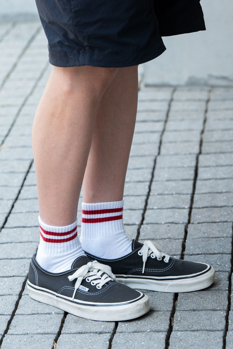 ▶︎松野さんのスナップをすべて見る松野大輔さん(36歳)ラストはテアトラのシャツ&ショーツをセットアップ風に着こなした松野さん。シャツの袖を数回捲り、ショーツとのバランスをとった点も素晴らしい。そんな洒落者の彼が指名したのはやはりオーセンティック。適度に履き込んだ感のある一足には赤のラインが入ったヘインズソックスと合わせて。クールなワントーンコーデに、ほんの少しだけ遊び心を足したのもいい。