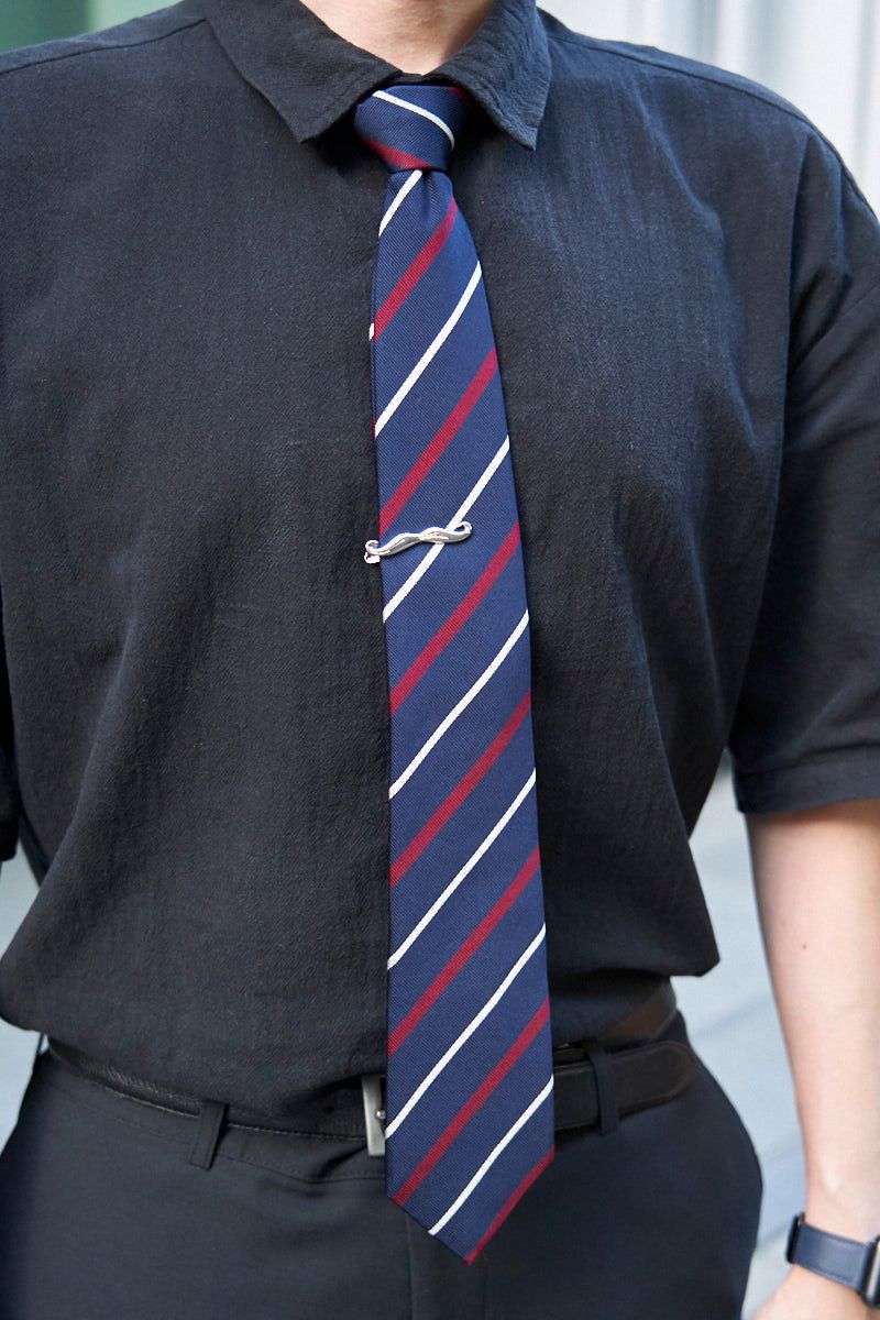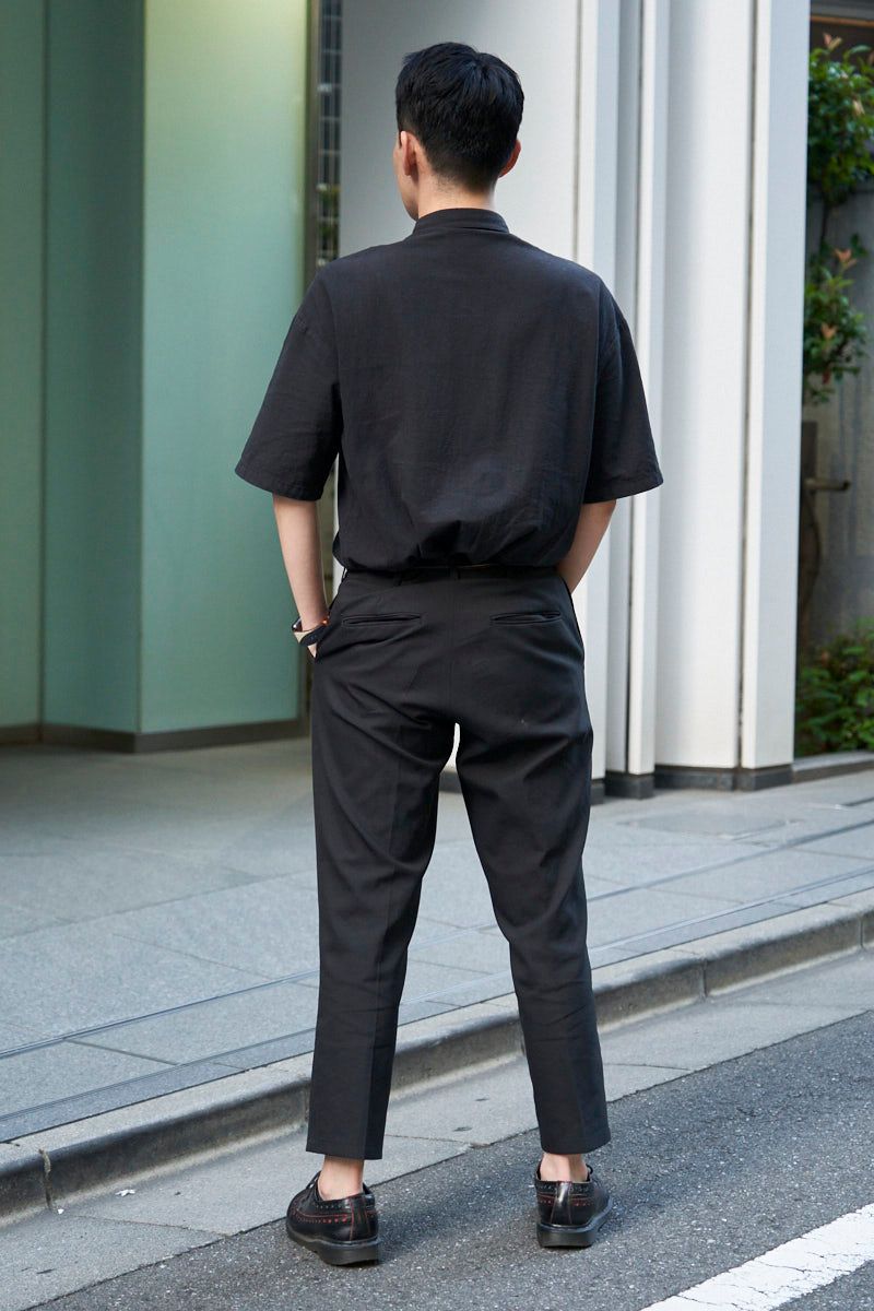 パリッとした黒シャツに、同じく黒のスラックスを合わせた清潔感と大人らしさが際立つブラックコーデ。ポイントはそこに加えたネクタイだ。トラディショナルなストライプ柄を取り入れることで、全身ブラックの重たさを回避し、スタイル全体にリズムを生んでいる。