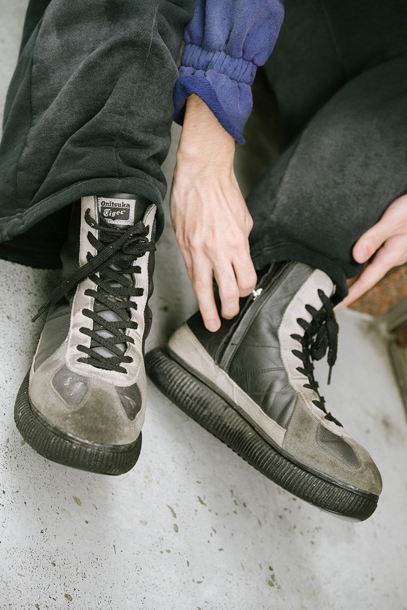 ▶︎小池さんのスナップをすべて見る小池駿之介さん(25歳)オニツカタイガーといえばスリムなローテクデザインというイメージがあるが、小池さん(写真右)が選んだのはボリューミーなブーツタイプ。内部ジッパーで着用がイージーな「デレシティブーツ」だ。