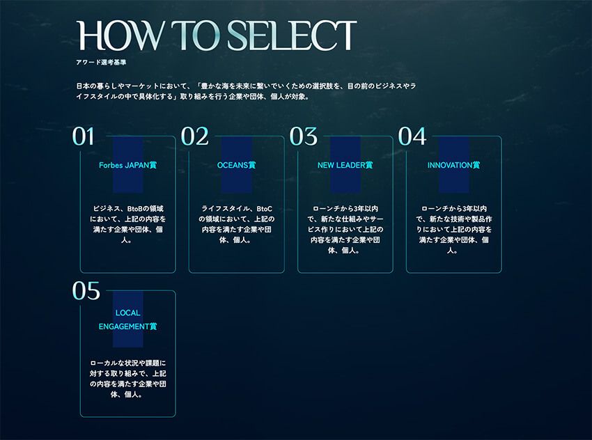 アワードでは「Forbes JAPAN賞」「OCEANS賞」「NEW LEADER賞」「INNOVATION賞」「LOCAL ENGAGEMENT賞」の5部門を設定。受賞企業の決定にあたり、海洋保全の第一線で活躍するリーダーたちがアドバイザリーボードに名を連ねる。
