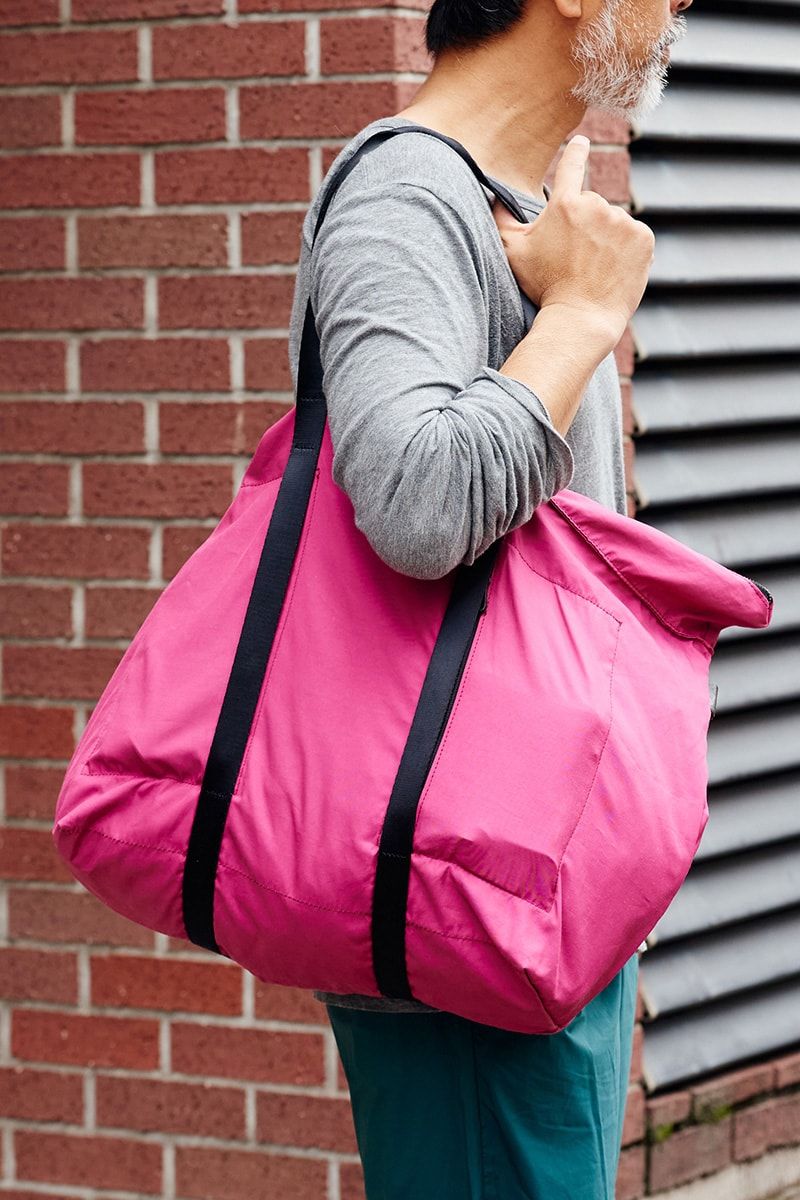 【写真7点】「ビビッドカラー1点投入の効果は絶大! の詳細を写真でチェック① ビッグ&ピンクのトートバッグでパッと華やかに