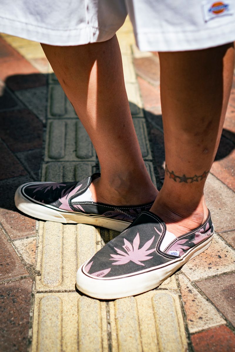 ▶︎佐々木さんのスナップをすべて見る佐々木 聡さん(50歳)秋口だからこそ楽しめるスウェット&ショーツスタイルだが、足元はまだまだサマームード! ヤレ感のあるアッパーに描かれたリーフ柄にカリフォルニアブランドらしさを感じさせる。ディッキーズとヴァンズという合わせは定番だが、ショーツは白でスリッポンは黒×ピンクというカラーコーディネイトが新鮮だ。