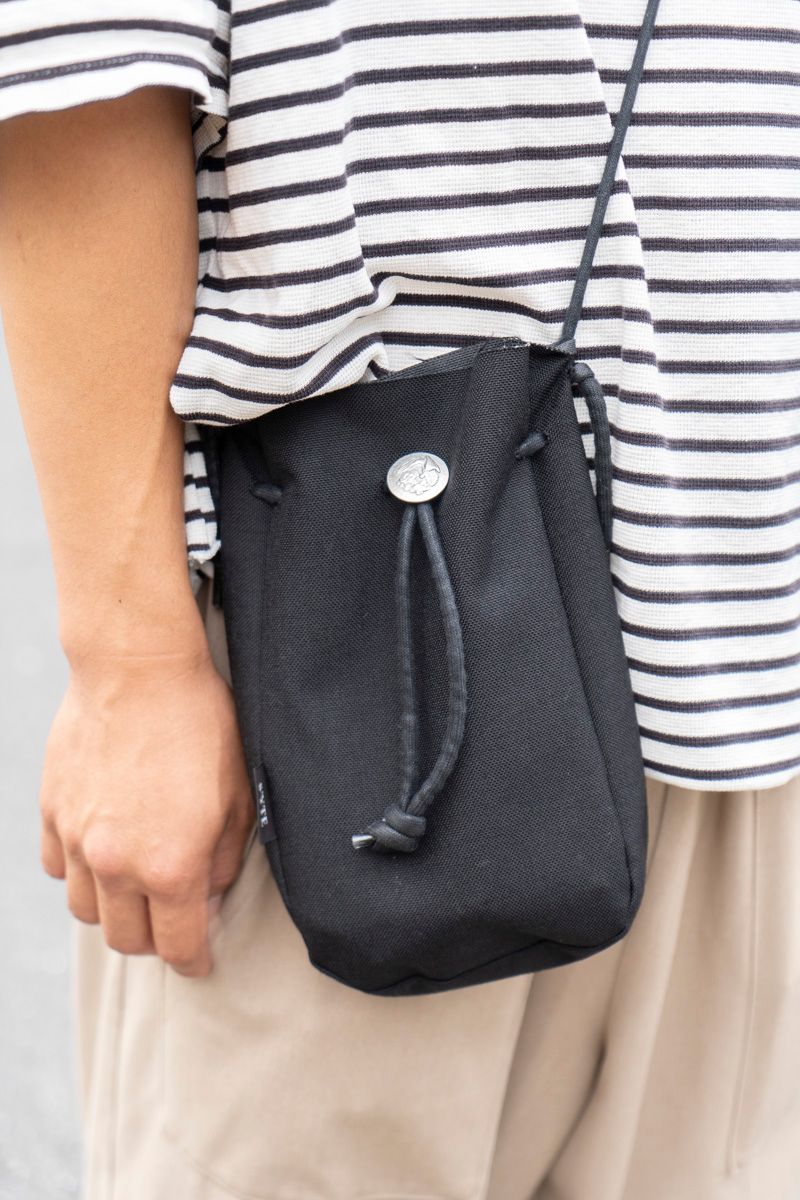 ▶︎高見さんのスナップをすべて見る高見昌義さん(29歳)ゆるいボーダーTが今の気分を映し出す、軽快なカジュアルコーデを披露してくれた高見さん。装いのアイキャッチになっているのが、巾着型の黒いショルダーバッグだ。