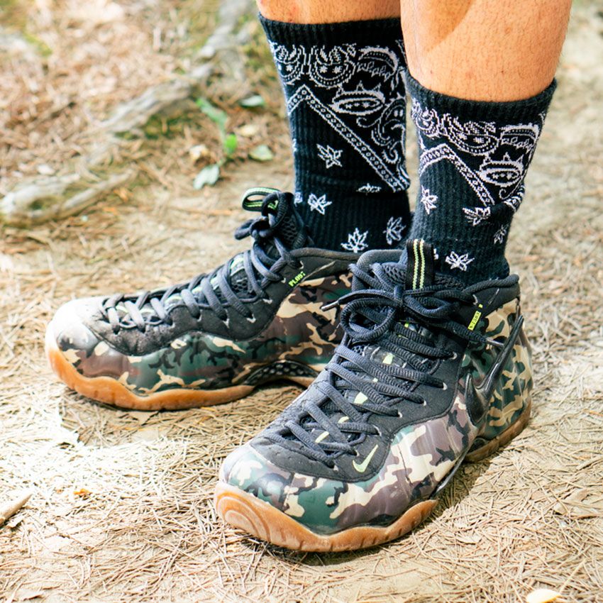 ナイキの迷彩柄スニーカーに、バンダナ柄をプリントした黒ソックス。柄と柄を掛け合わせながらも、ごちゃごちゃ感は皆無だ。そのキモになっているのは、ショーツとソックスの色合わせによる絶妙なカラーバランス。印象的なのに、まとまっている!