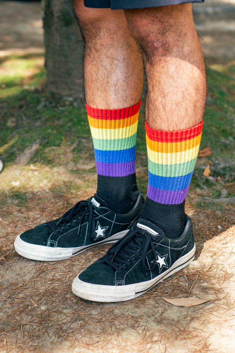 ▶︎福原さんのスナップをすべて見る福原 興さん見上げれば虹、ではなく“見下ろせば虹”。賑やかな柄シャツにも負けない、7色のソックスがとにかくキャッチーだ。こんなソックス、弛ませるのはモッタイナイから福原さんのようにピシッとはきこなしたい。