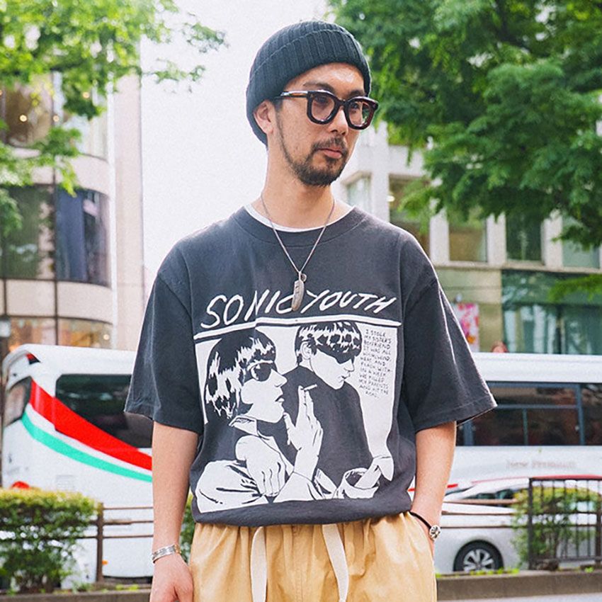 ▶︎テジマさんのスナップをすべて見るテジマユウトさん(33歳)ソニックユースのデビューアルバム「GOO」。そのジャケ写を載せた印象的な1枚を、あえてタックインしてキレイに。彼らの音楽よろしく、ある意味で挑戦的にも映る。