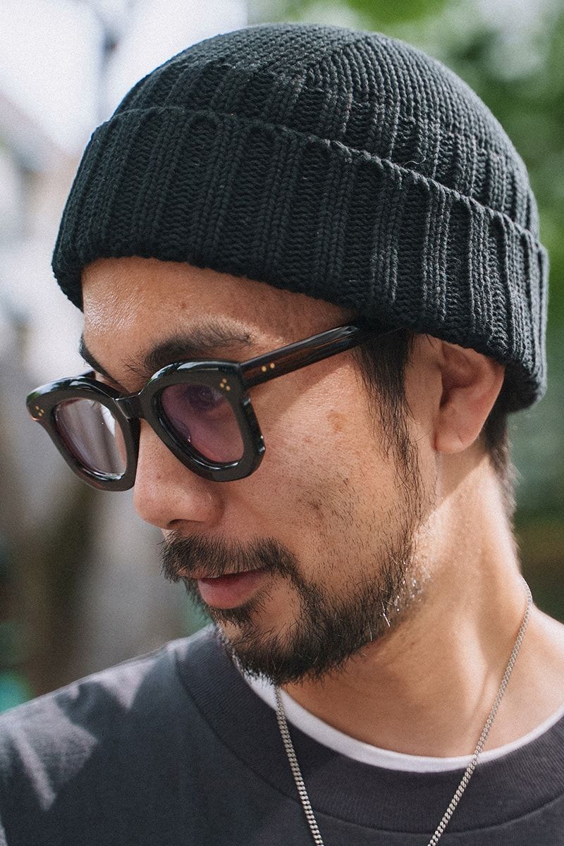 Tシャツ=ソニックユース パンツ=古着 サンダル=ビルケンシュトック 眼鏡=マックスピティオン 帽子=ザエイチダブリュードッグアンドコー