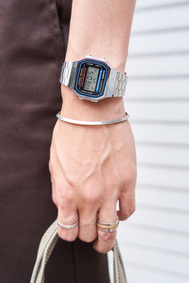 手首には同じく古き佳きアジのあるカシオのデジタルウォッチを巻いて、足元はリカバリーサンダルでコンフォートに。独特のミックス感が光る。