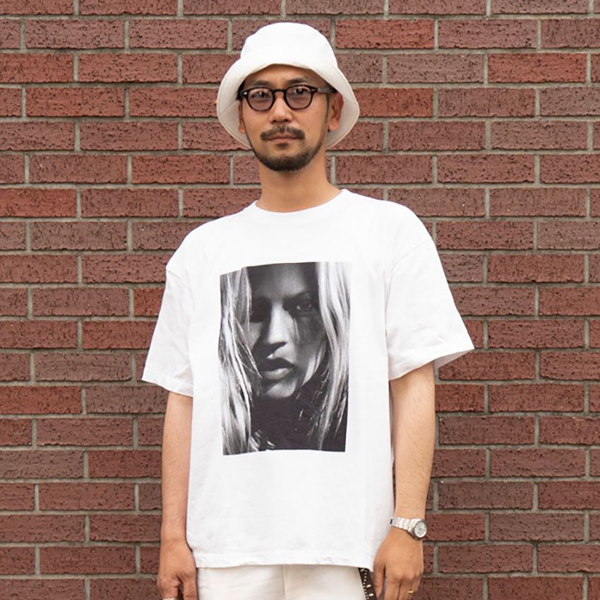 ▶︎左達さんのスナップをすべて見る左達 優さん(39歳)白いTシャツに白いパンツ。ケイト・モスのアートなモノクロ写真が浮き立つ、まるでキャンバスのような装いだ。とはいえ上下の白で差を付け、立体的な見え方も獲得した。