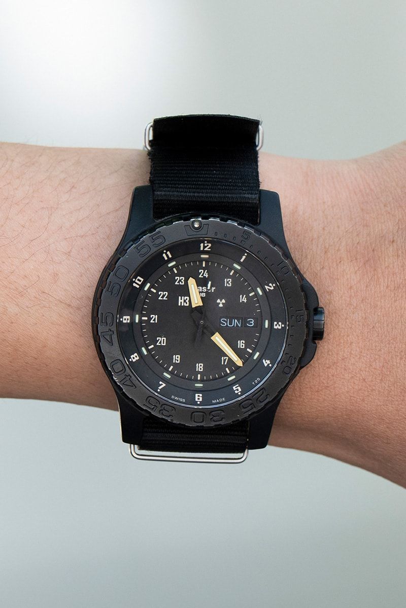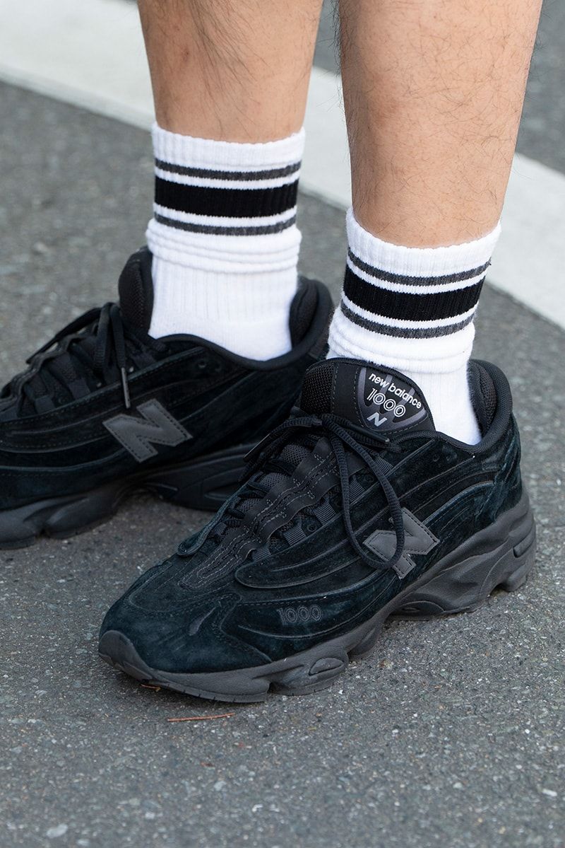 スニーカーもアイウェアも時計も黒で揃えつつ、ソックスとインナーのライン使いで遊びを演出。邪な気持ちなきクールな黒の横縞が、面白いほど効いている。