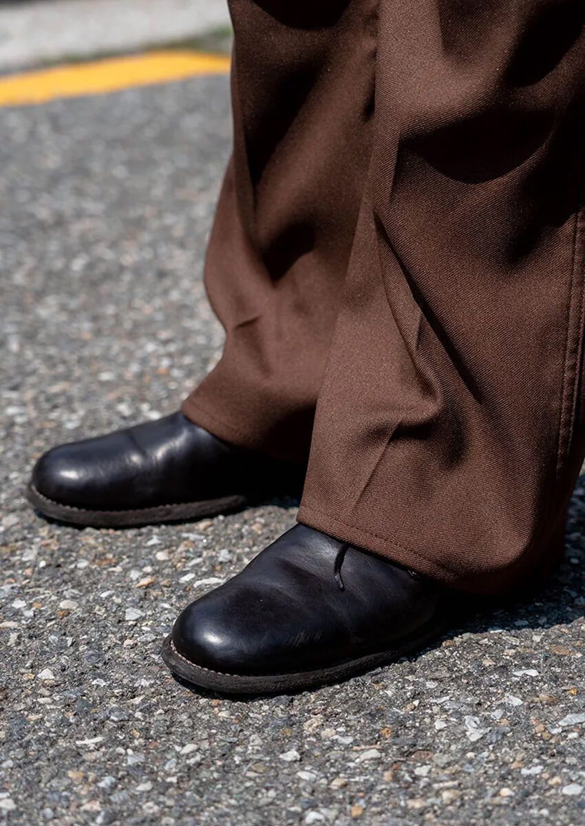 無二の個性を放つ着こなしに合わせたのが、グイディの一足だ。華美なトップスやバッグ、アクセサリーを散りばめたコーデも、シックなレザーシューズによって大人の装いに。