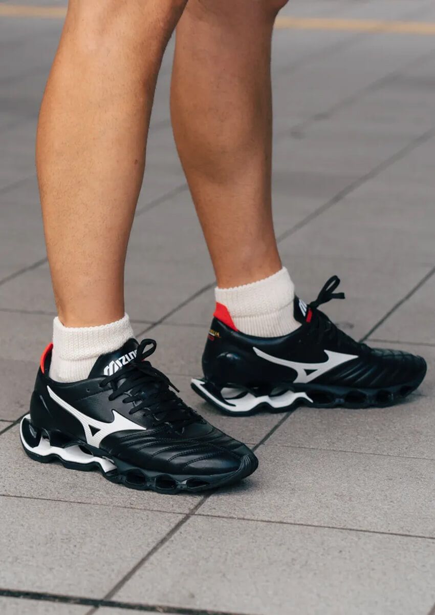 小林さんが愛用するのはミズノの「WAVE PROPHECY MORELIA NEO」。フットボール由来の一足は、ハイテク感あるソールと赤のアクセントが特徴的。白ソックスと合わせれば、足元で無二の存在感を放つ。
