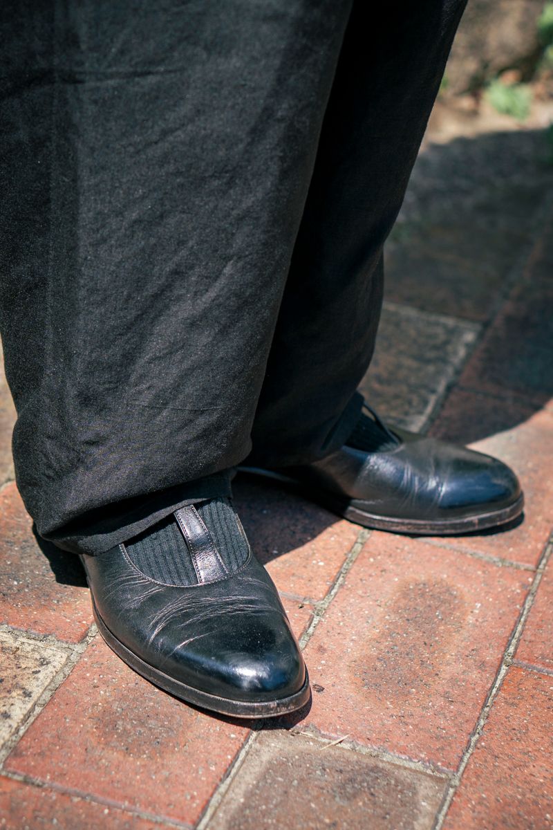 ▶︎酒井さんのスナップをすべて見る酒井弘治さん(27歳)黒のワイドパンツに同色のシャツを羽織ったシックな装い。トップスの微細なドット柄や透け感のある素材が、重たくなりがちなオールブラックコーデに奥行きを与えている。