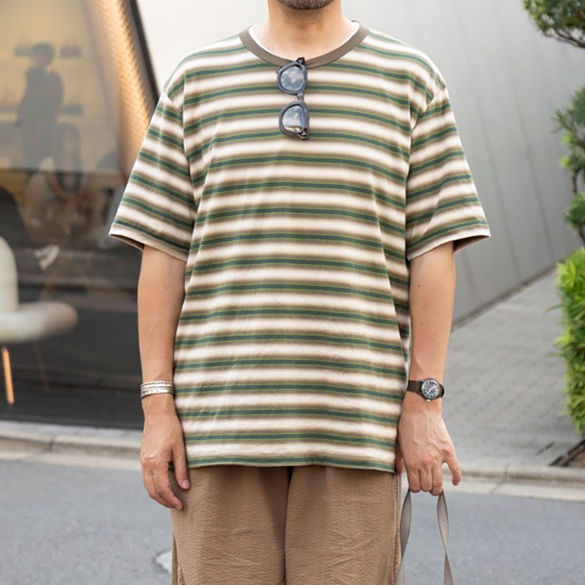 ▶︎植村さんのスナップをすべて見る植村 健さん(51歳)グリーンをベースにしたボーダーTと、ブラウンのショートパンツを合わせたアクティブなスタイル。足元もベージュ系のスニーカーで軽快にまとめ、全体の色調をトーンオントーンで統一。