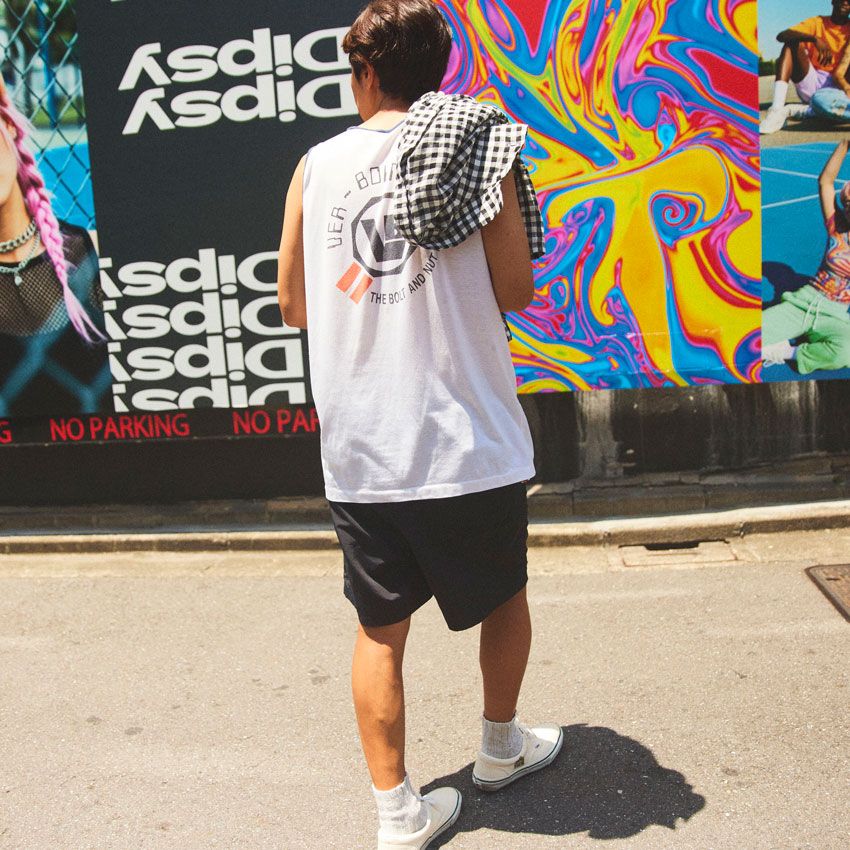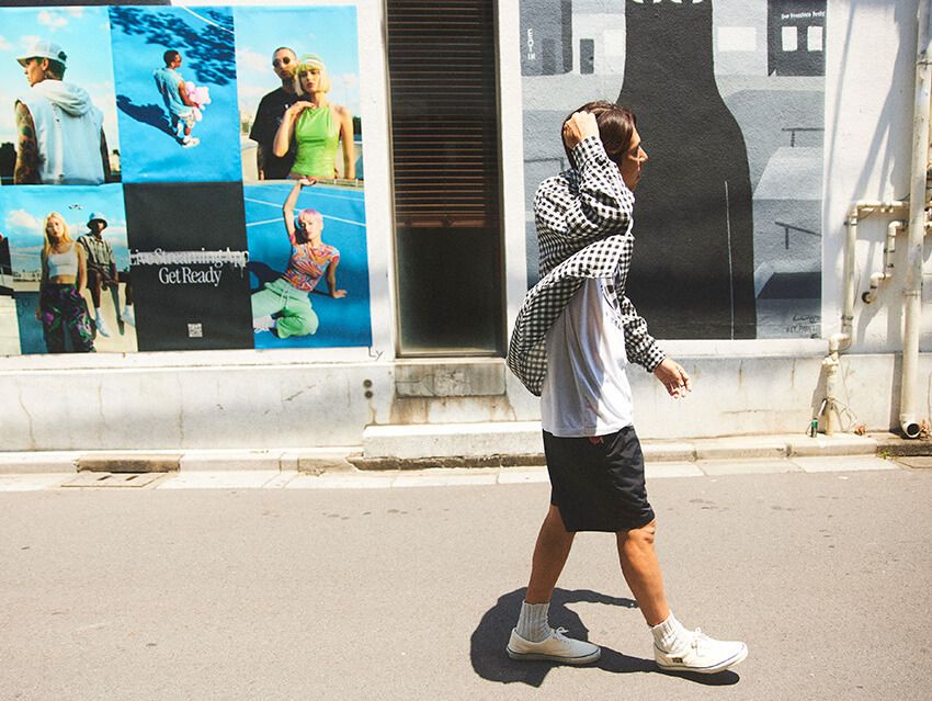 ヴァンズは’90年代のエラ。下北沢のヴィンテージスニーカー専門店「SOMA」で見つけ、欲しいと思っていたら行きつけの焼肉店のお母さんがプレゼントしてくれたそう。手編みの靴下もプレゼントで貰ったもの。編みの緩さがヴィンテージのシューズと共鳴し、リラックスしたムードをあと押し。