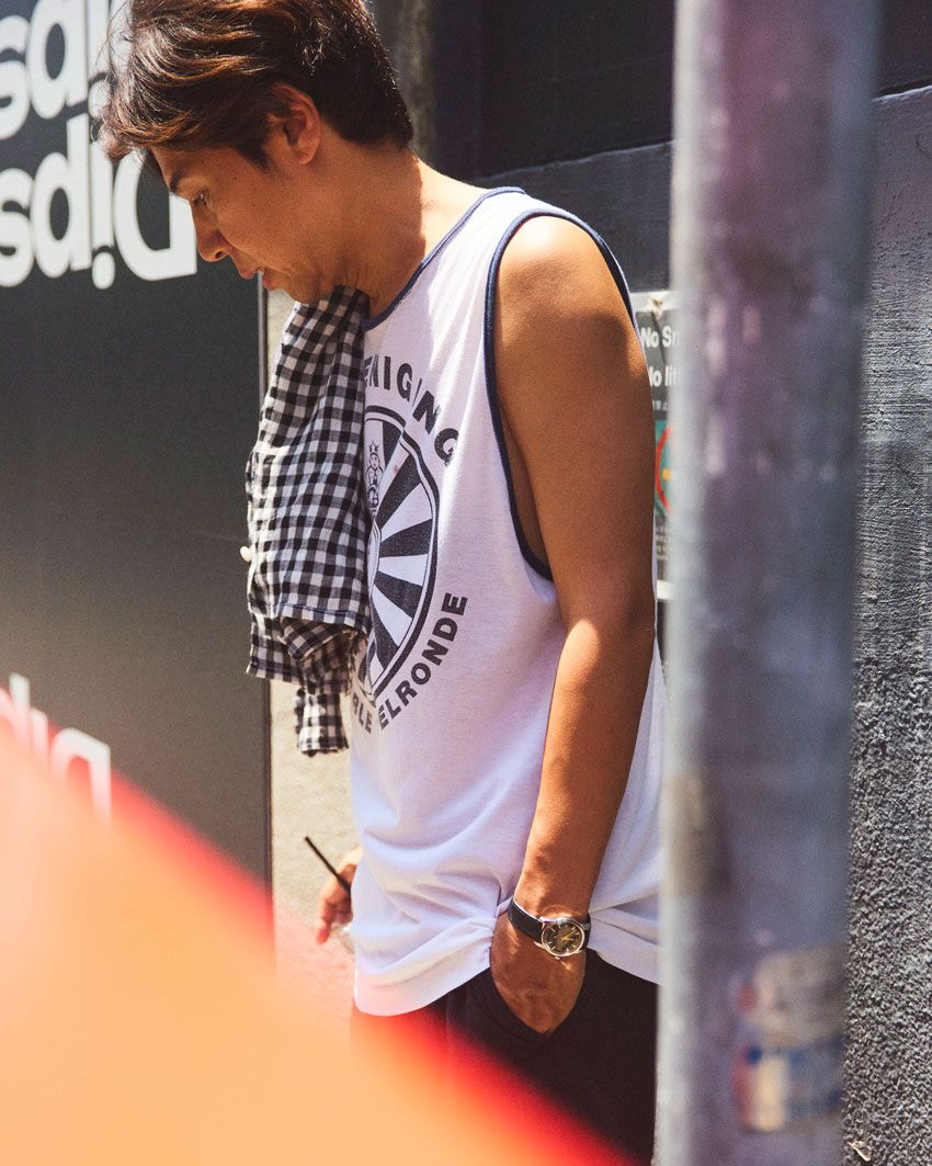 腕元で光るのは’52年式のオメガ。「ハーフローター式のやつ。今は高なってるんすよね? 当時は全然安かったんです」。