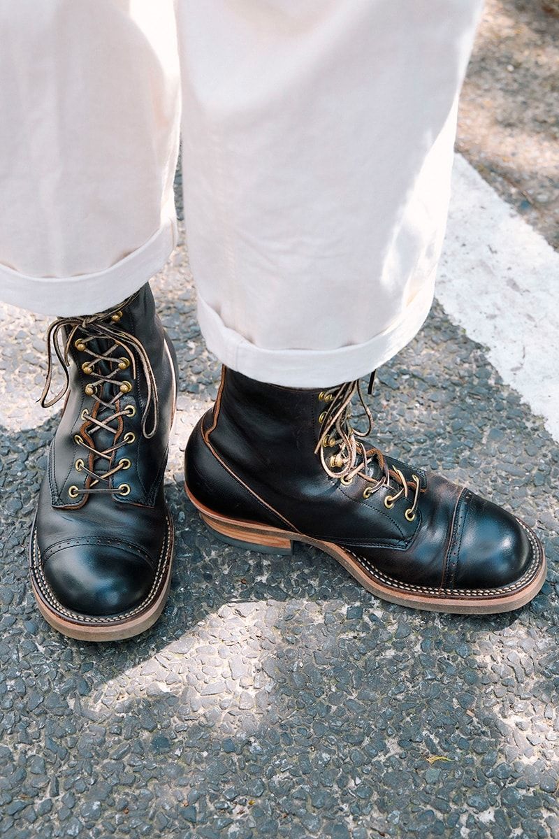 ▶︎反保さんのスナップをすべて見る反保久志さん(43歳)ワークな白パンはロールアップして短めに、そしてハンドメイドのブーツを覗かせる。どこかモーターカルチャーの香るスタイルをモノトーンでまとめるという、洗練とタフが混じり合った装いだ。凹凸感のあるシャツで、色みはなくとも表情のあるコーディネイトに。
