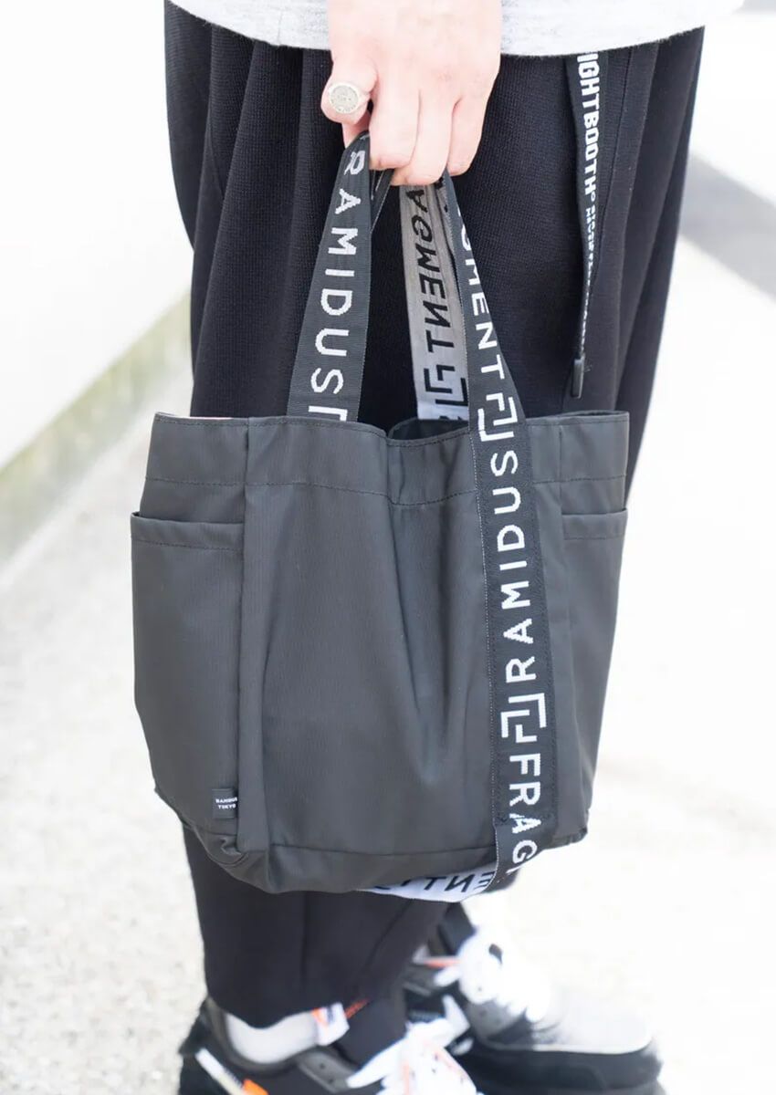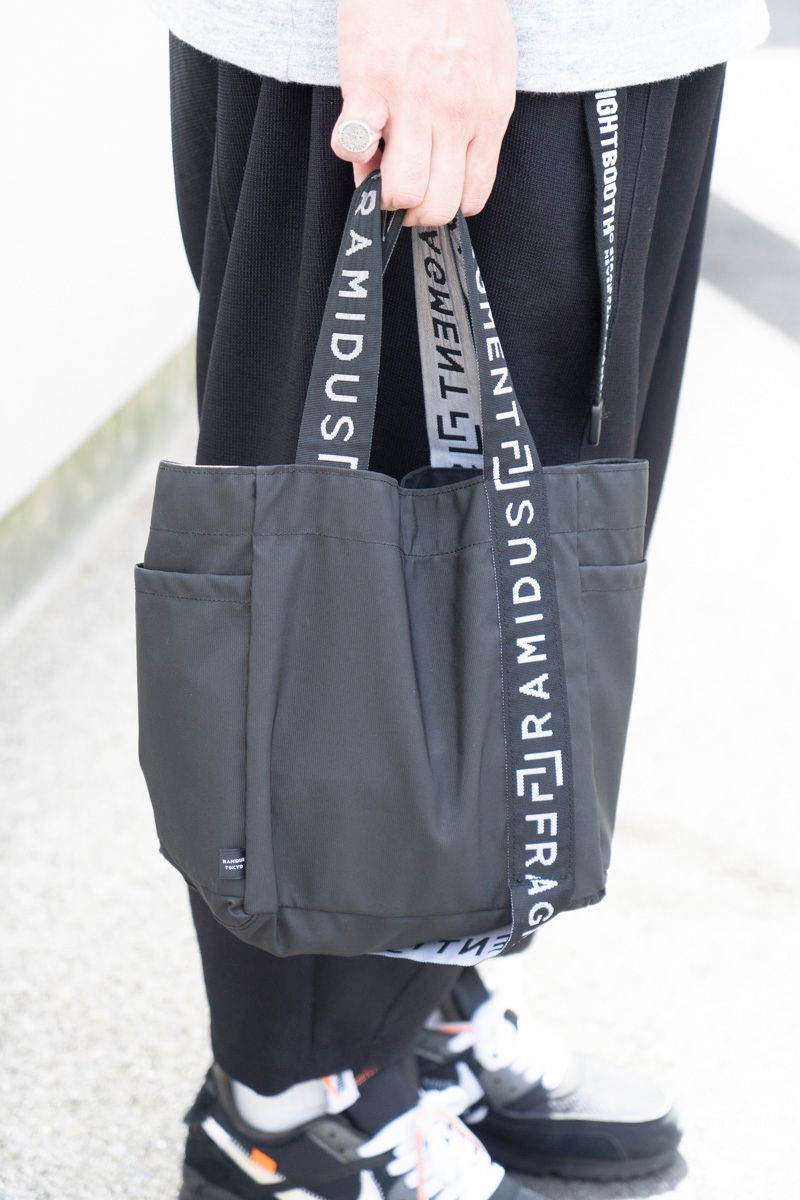 一方、バッグの主張も負けてはいない。原宿生まれのラミダスと藤原ヒロシ氏のコラボレートによる、グッドセンスなモノトーン。サイズは小さくとも存在感は大きく、コーディネイトをピリッと引き締める。