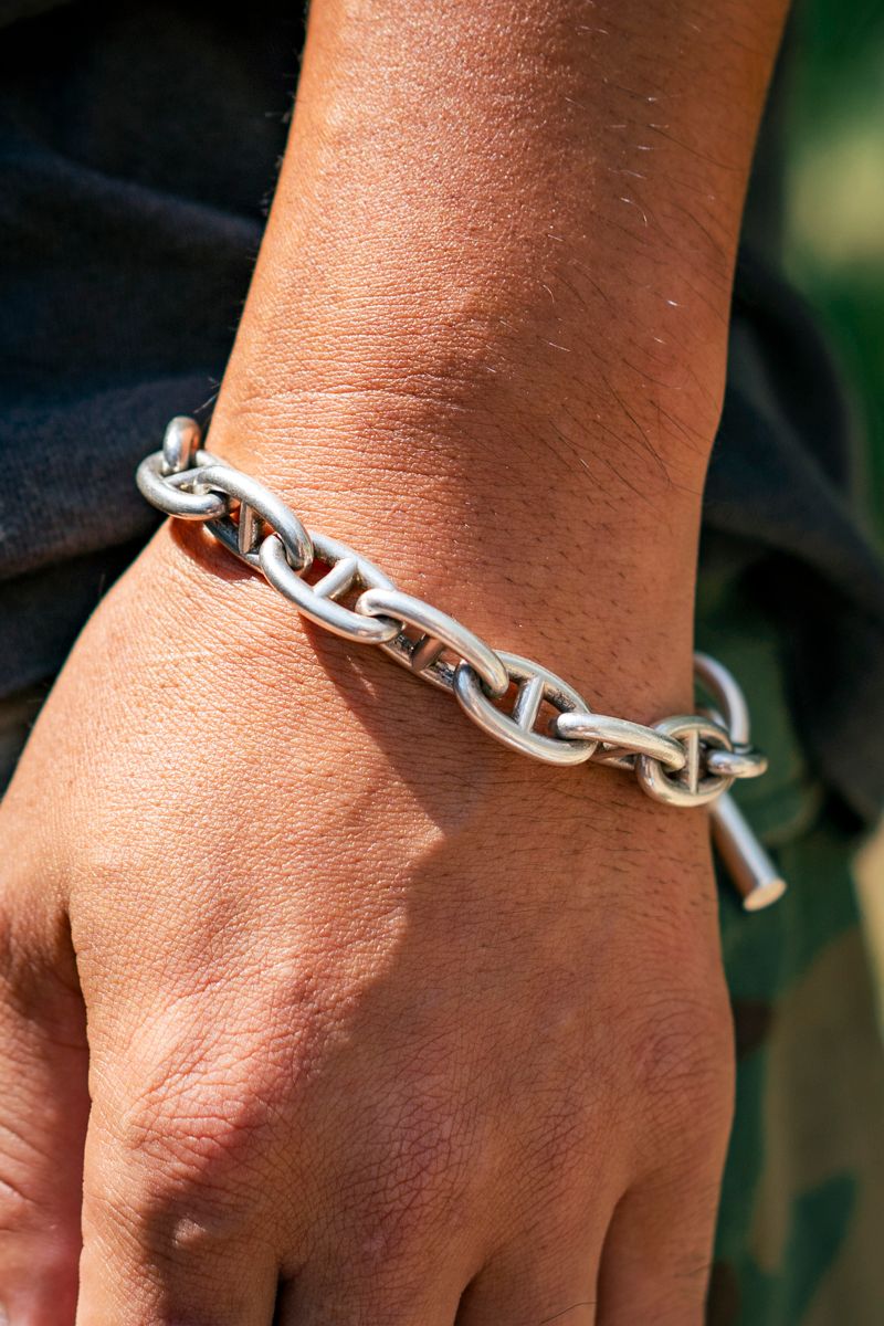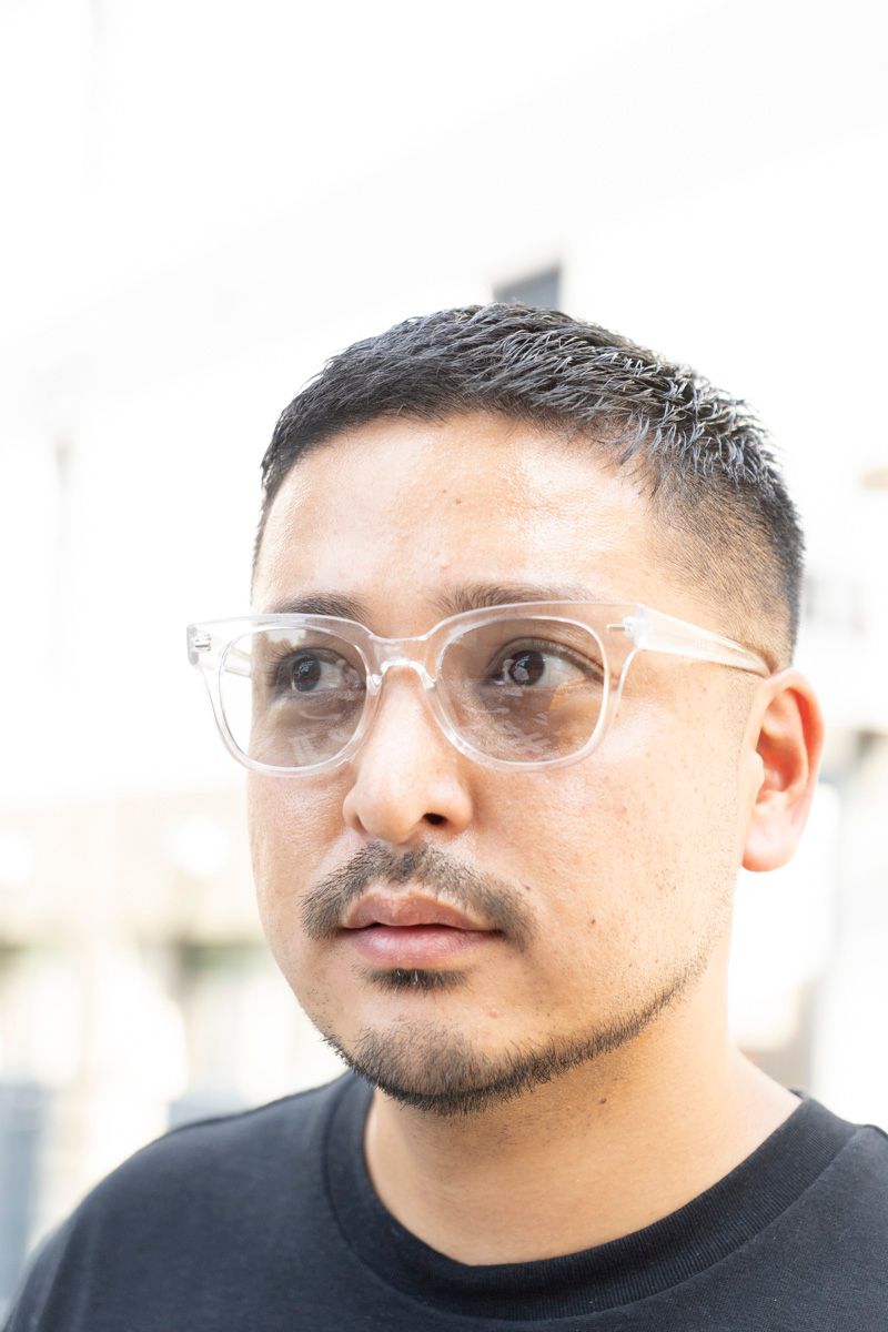 Tシャツ=ヴィンテージ パンツ=ラルフ ローレン シューズ=ヴァンズ 眼鏡=ノチノオプティカル ブレスレット=エルメス バングル=ノーブランド