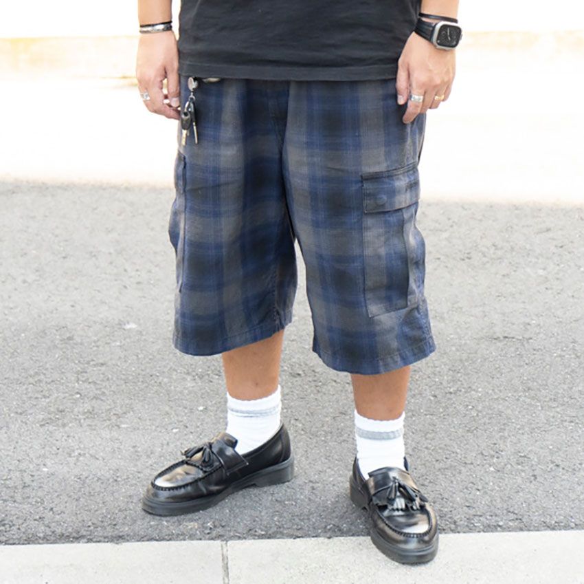▶︎中谷さんのスナップをすべて見る中谷俊雄さん(37歳)膝までしっかり覆う長めのレングス、タータンチェック的な色柄。カーゴポケットが埋もれそうなほどの個性を発する“キャラ立ち”ショーツを、シンプルな黒Tでいなした。