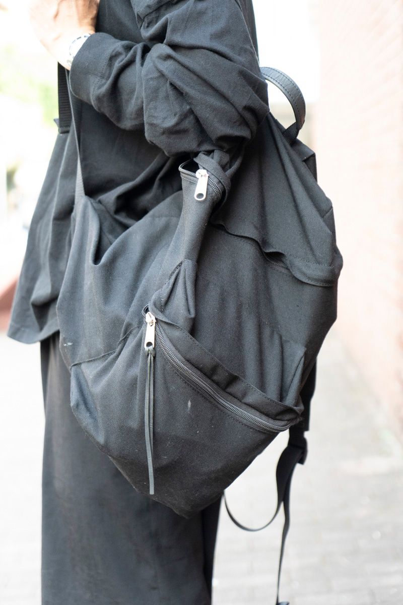 目を凝らして見てみると、ショーツは膝下丈、カットソーはややルーズ。それにボリューミーなバッグと、黒一色でありながら表情は豊か。レベルが高い。