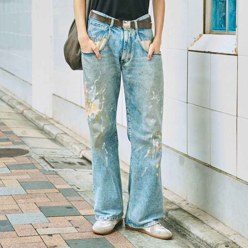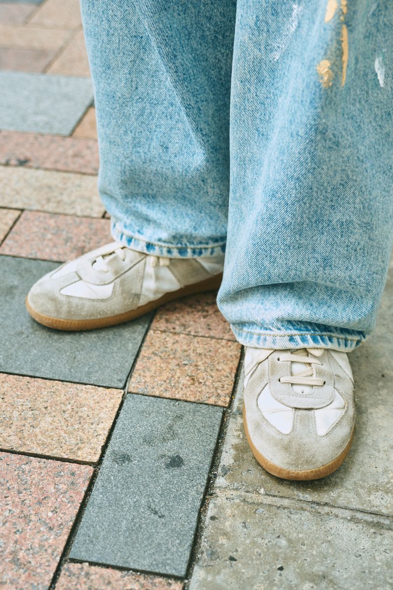 ▶︎レンさんのスナップをすべて見るレンさん(20歳)白のジャーマントレーナーもやっぱりいい。ブルーデニムとも安定の相性で、履き込まれた感じが味わい深い。存在感を放つ、ペンキが散ったデニムも同じくマルジェラだが、合わせているアイテムがさっぱりしているからウルさく見えない。