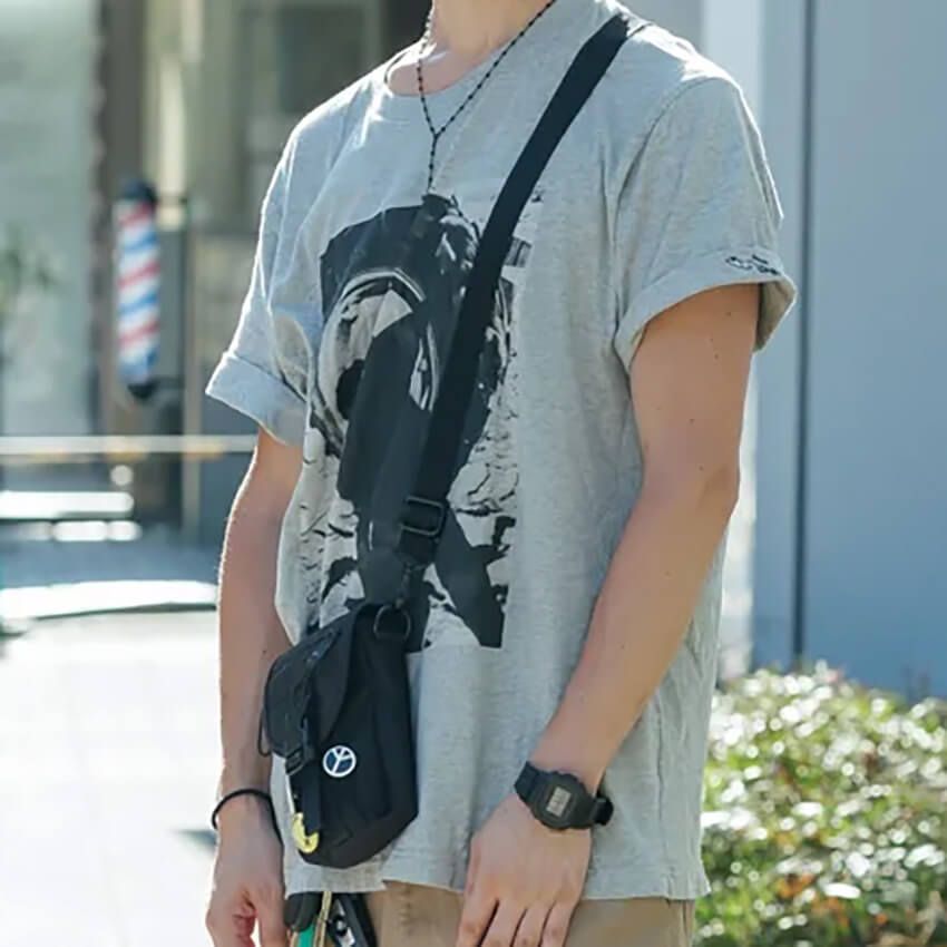 Tシャツ=オーシバル パンツ=ユニクロ シューズ=サロモン 眼鏡=アイヴァン バッグ=ブートラボ リング=ヴィンテージ