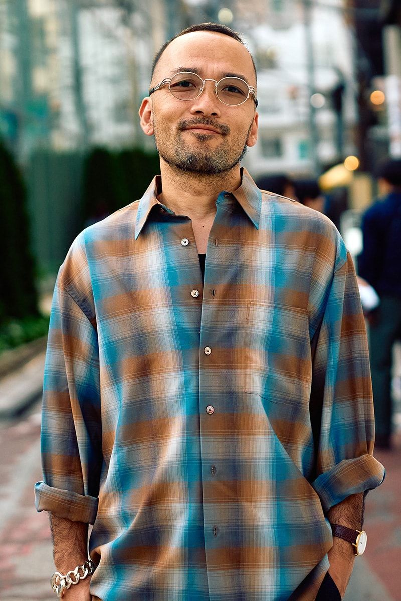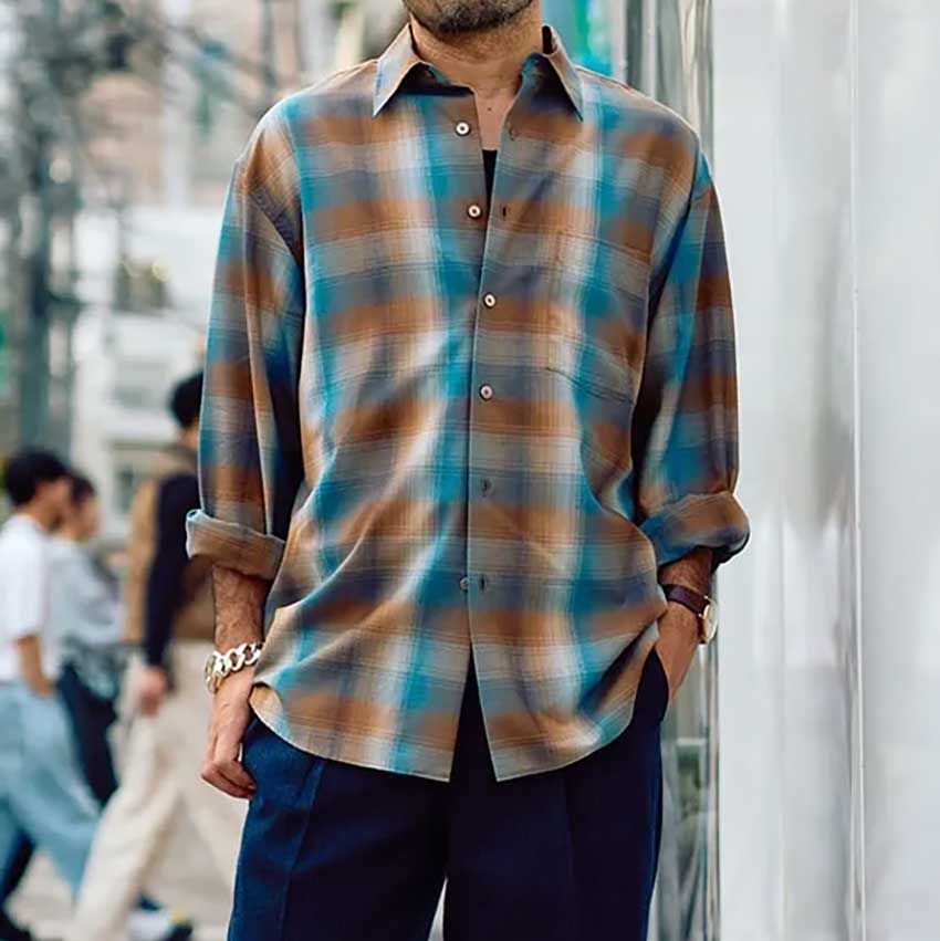 石神さんのスナップをすべて見る石神良英さん(41歳)ブルーとブラウンが混ざり合うチェックシャツを主役に、濃紺パンツを合わせたシックな組み合わせ。柄を取り入れながらも落ち着いたトーンで、大人らしい品の良さが漂う。