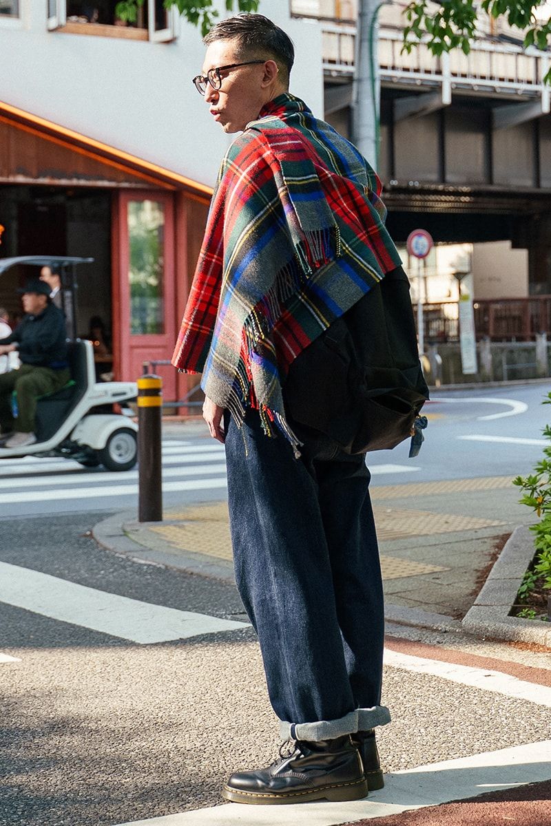 土井さんのスナップをすべて見る土井健雄さん(44歳)夏から引き継ぐ白Tとデニムの至極シンプルなコーディネイト。そこに、鮮やかなタータンチェックのストールを投入し、一気に秋らしいムードへ。暑さが残るこの時季も、小物使いで季節感を演出できる。