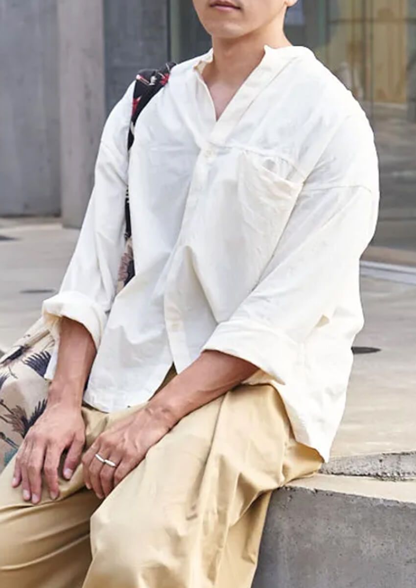 ▶︎片山さんのスナップをすべて見る片山 健さん(28歳)生成りがかった白シャツがお似合いの片山さん。サイジングはやや緩めで、襟を抜きつつタックアウトして着こなした。そんな秀逸な一着に合わせたのは、ベージュの太パンツ。