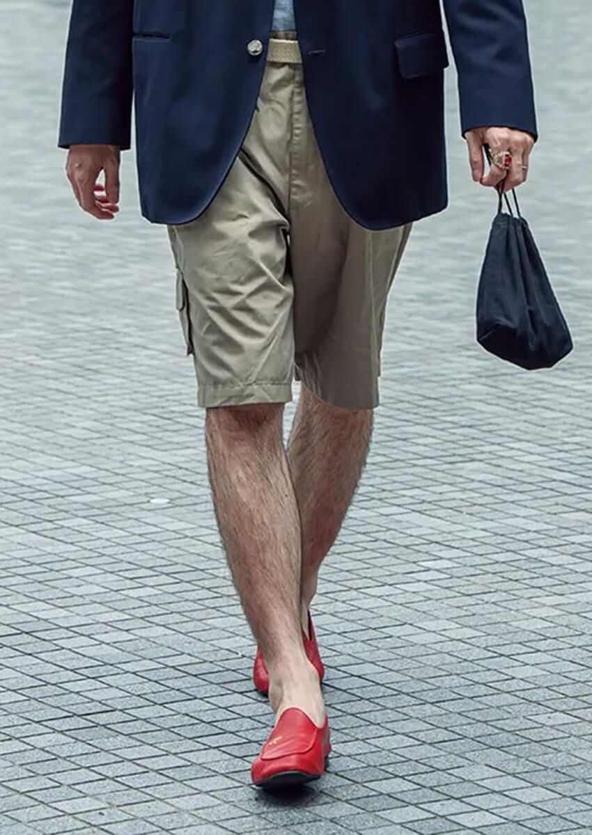▶︎山下さんのスナップをすべて見る山下雅人さん(42歳)ネイビーブレザーにグレートーンのTシャツ。トラッドで上品な組み合わせの装いのなか、ボトムスにはステューシーのカーゴショーツを選択し、端正かつリラックス感のある着こなしに。足元の赤ローファーで色を挿せば、クラシック&ストリートが共鳴する大人の装いの完成だ。