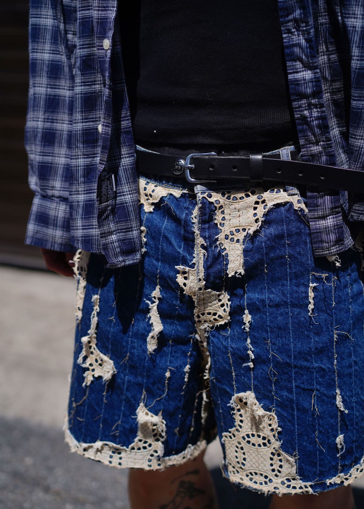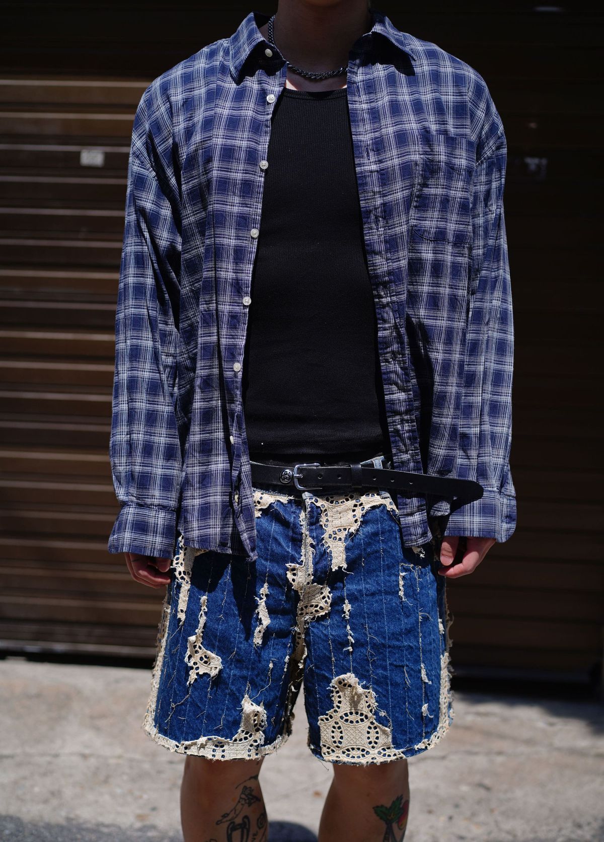 ダメージデニムショーツにチェックシャツを羽織った、存在感のあるストリートスタイル。ブルーを基調にしたカラーリングも爽やかで◎。
