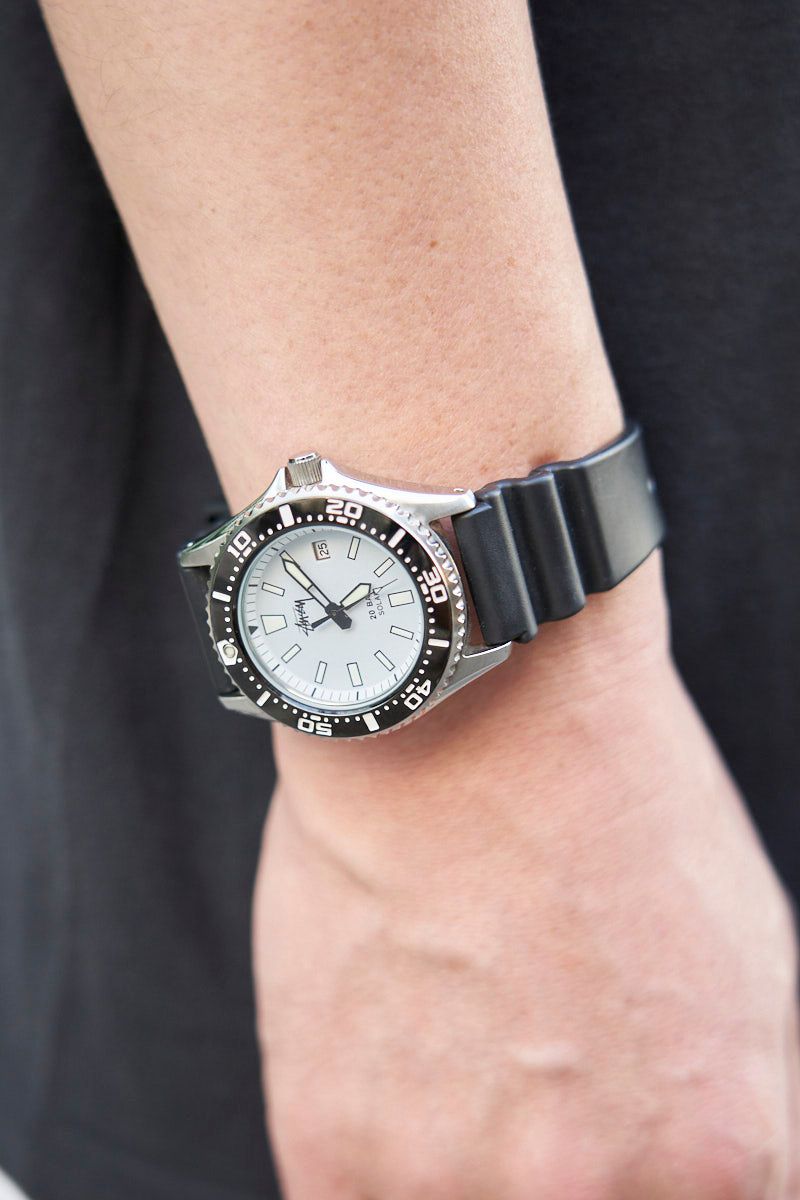 グラフィックTシャツにディッキーズ、そして足元はサンダルとソックス。ストリートコーデに忠実なアイテム選びで、オールブラックの装いに仕上げている。腕に光るのはステューシーのウォッチだ。ダイバーズさながらの見た目に、遊び心を感じるね。