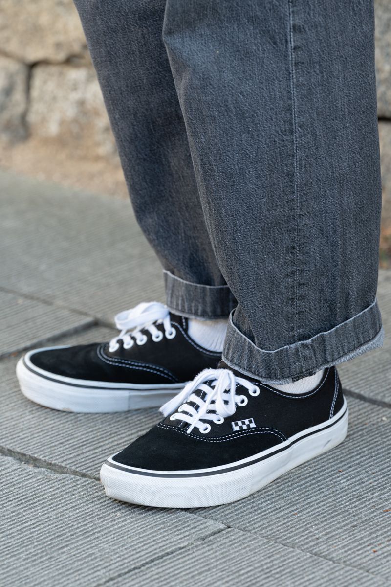 シャツ=ダイワ ピア39 Tシャツ=ヘインズ パンツ=シュプリーム シューズ=ニューバランス 帽子=シュプリーム×フォーティーエーカーズクロッカー 腕時計=アップル