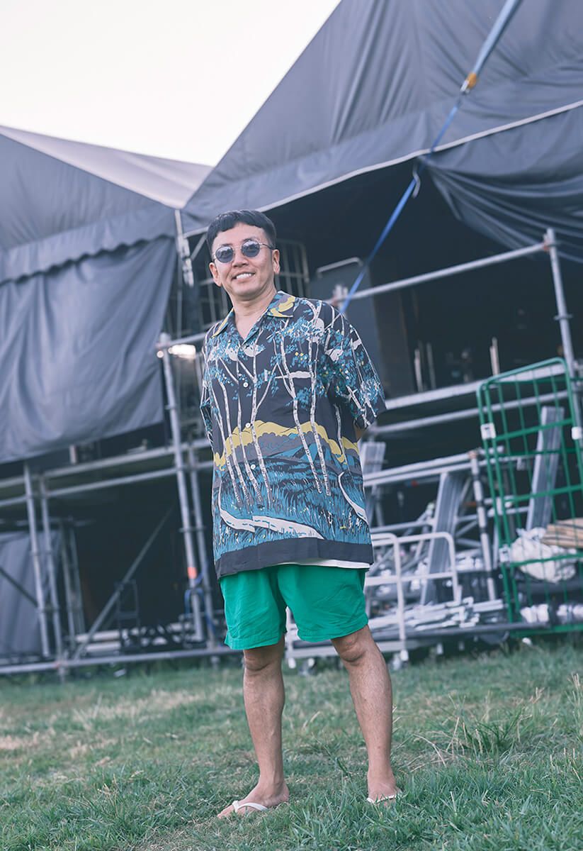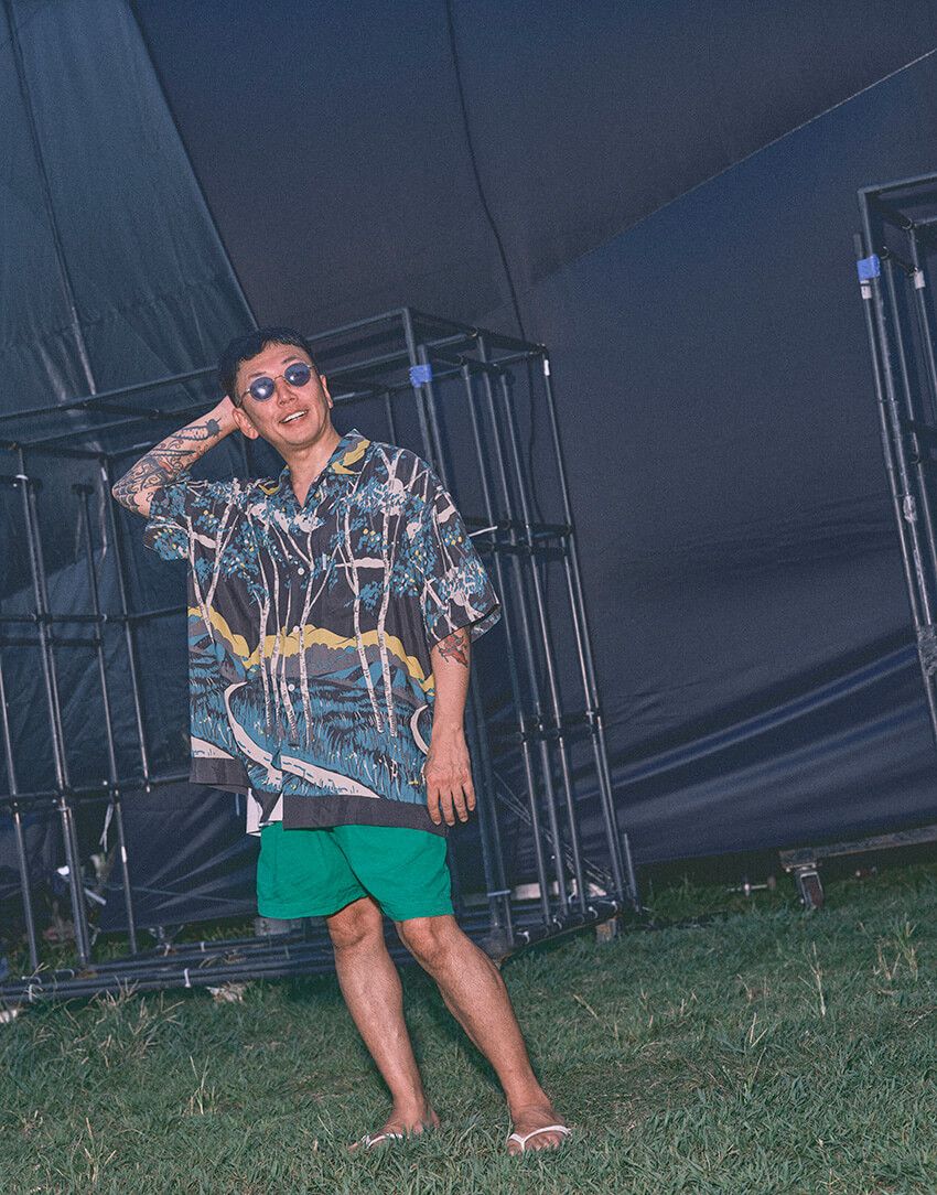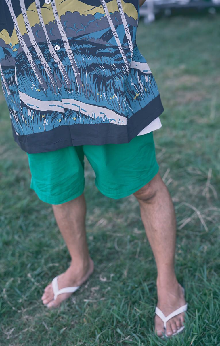以前「カメレオン・ライム・ウーピーパイ」と曲作りしたときのMV撮影で「派手に来て」って言われて(笑)。そのとき「ワコマリア」で、緑系のアロハとパンツを見つけて、着てみたら意外とハマったんです。「緑も良いじゃん」って偶然の出合い。それで今日も緑を着てみました。