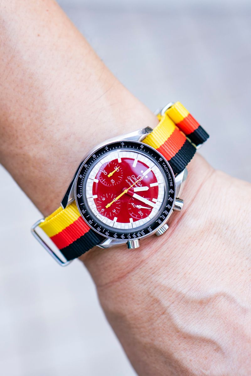 ドイツ国旗柄のストラップを備えた“スピマス”のミハエル・シューマッハモデルや足袋型のサンダルなど、個性的小物の御姿はそこかしこに。パンツのストライプも粋だ!