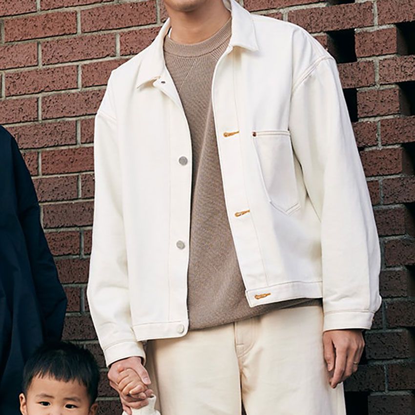 ▶︎堀さんのスナップをすべて見る堀 旭さん(32歳)上下を白で合わせて、マイルドなカフェラテカラーのインナーを忍ばせる。Gジャンライクな短丈デザインは、着回し力も安定感も抜群。なにより、大人っぽく品良く見える。