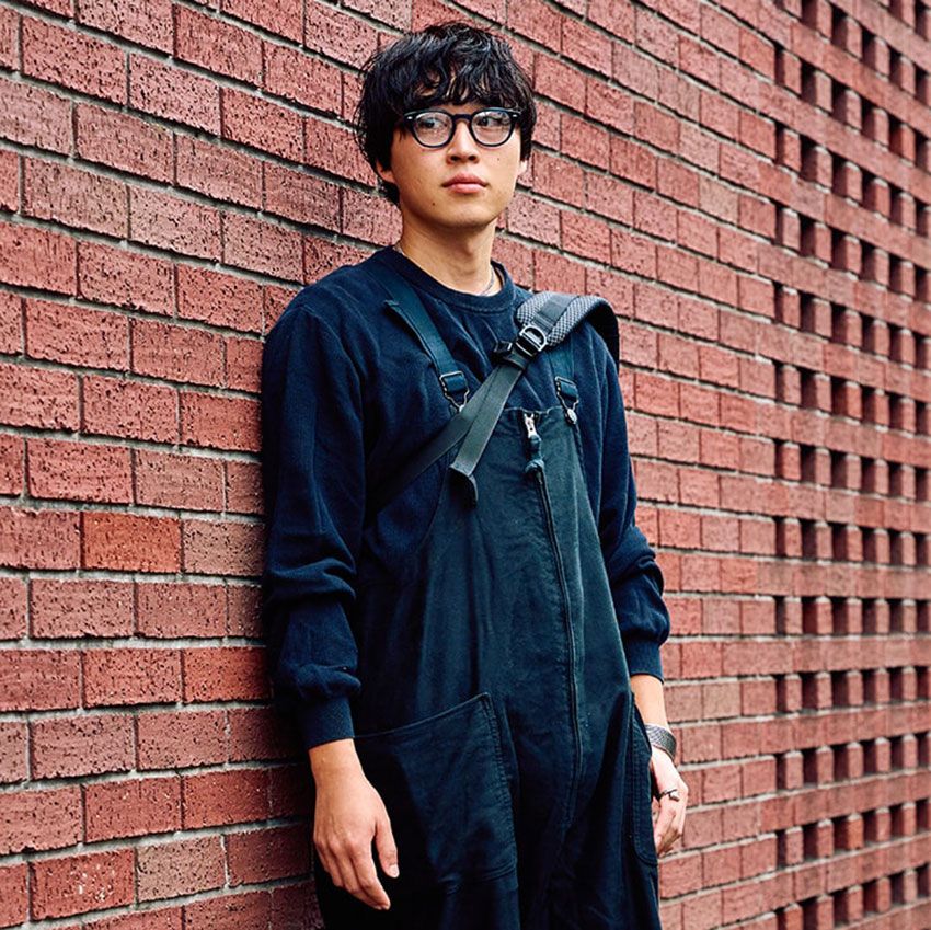 オーバーオール=キャプテンサンシャイン カットソー=古着 スニーカー=アディダス オリジナルス 眼鏡=オリバーピープルズ