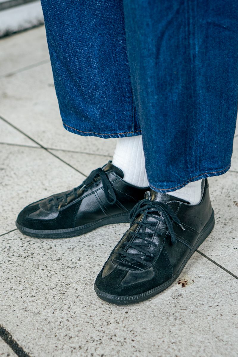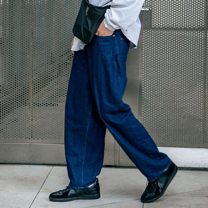 ▶︎原さんのスナップをすべて見る原 響さん(31歳)お次はかなり大胆なルーズテーパード。横から見た写真だと少々分かりにくいが、股下が深めに設計されたサルエル風シルエットのインディゴデニムだ。