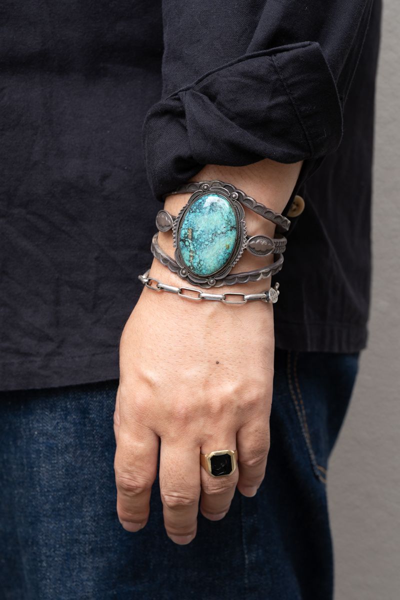 シャツ、デニム=ともにアトリエフロート シューズ=バーウィック 眼鏡=ヴィンテージ ブレスレット=コーナーズ