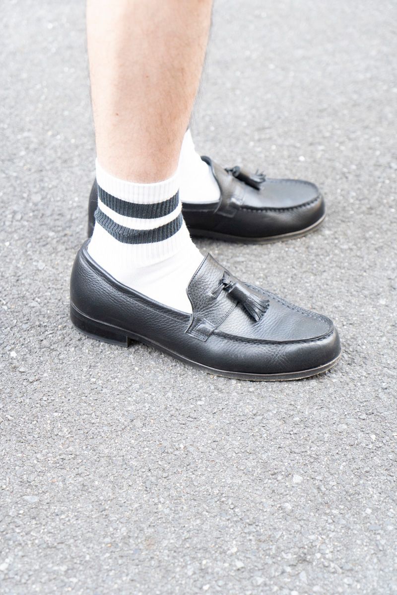 ラインソックスまでモノクロで統一してシンクロ率を高め、品のいいタッセルローファーで大人っぽさをアピール。で、顔周りはゴールドカラーで少々ドレッシーに。上手だ。