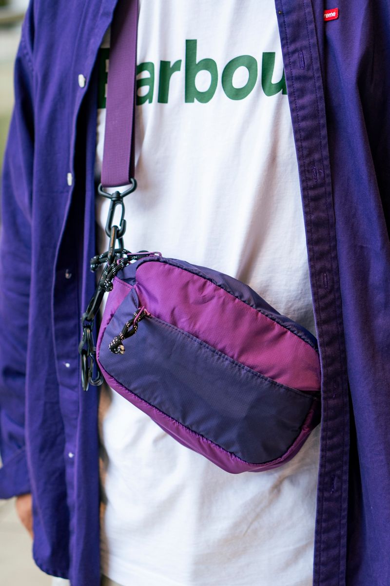 シャツのボタンの留め方、ストール使い、タックイン&ウエストポーチのバランスなど、全身くまなく見どころ十分。まるっと美味しい個性派である。