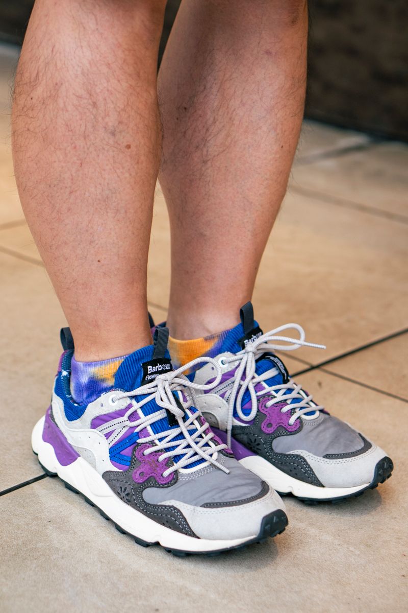 ▶︎竹内さんのスナップをすべて見る竹内一樹さん(57歳)パープルの合わせが印象的なトップスレイヤーのお供に、少々ワイドなカーゴショーツを抜擢。インナーとは風合いが異なる白が、洒脱で落ち着いたグラデーションを支える。