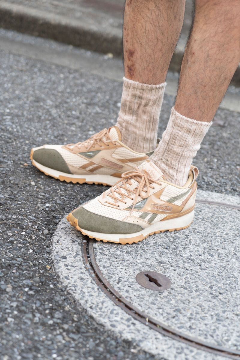 Tシャツ=オーラリー パンツ=セヤ シューズ=リーボック×エンジニアードガーメンツ 帽子=エンダースキーマ 眼鏡=アヤメ 腕時計=タイメックス バングル=ヴィンテージ