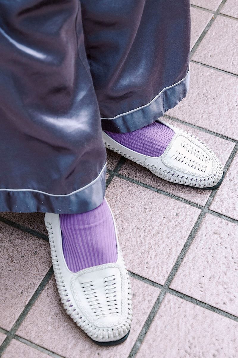 雰囲気十分のコンパクトなトップスレイヤーに、パープルサテン調のワイドスラックスをミックスした手腕も鮮やか。で、ソックスも紫でグラデを演出。ジーニアス。