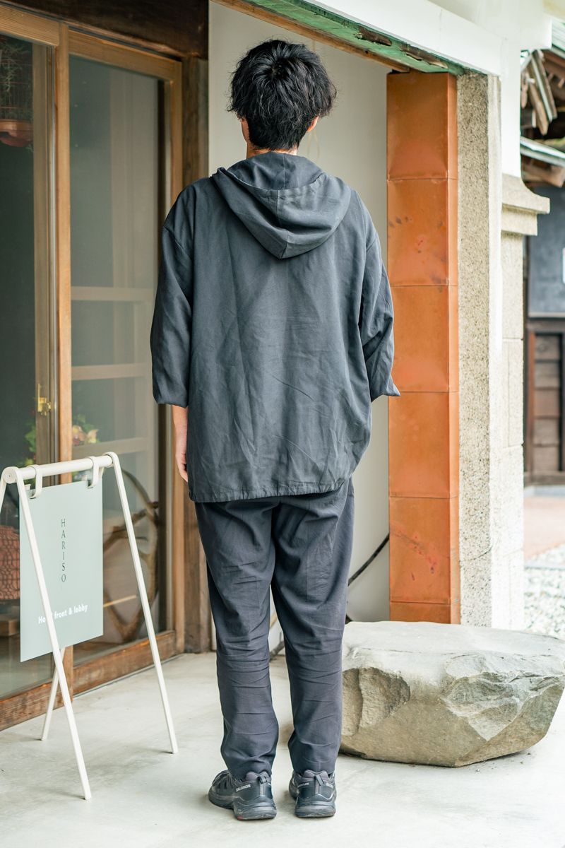 古着ならではの風合いが特徴的な黒のアノラックに、「ユニクロ」の同色パンツ。全身をダークトーンで統一したシックなコーデにサロモンのソールデザインが静かに主張する。街でもアウトドアでも成立する、万能な“黒サロモン”の妙味がここにあり。