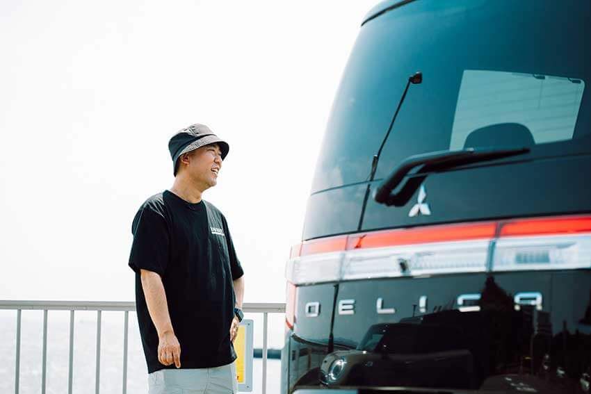 「三菱でいうと、パジェロとかアウトランダーとか足回りの強い四駆がほかにありますけど、このデリカは8人乗りなんですよ。車内が広い。燃費もいいし、国産だから修理もしやすい。燃料は軽油で、頑張れば20km/Lくらい走ります。人をたくさん乗せてドライブできる、自然のなかで遊べるタフな車。僕にとっては本当にデリカ一択なんですよ」。