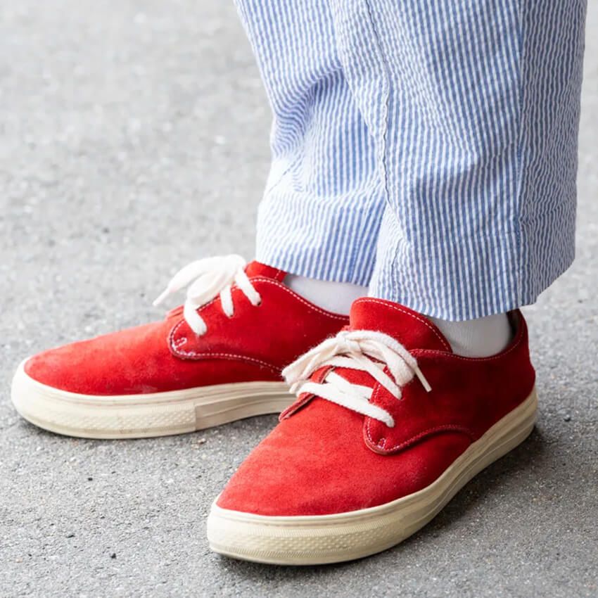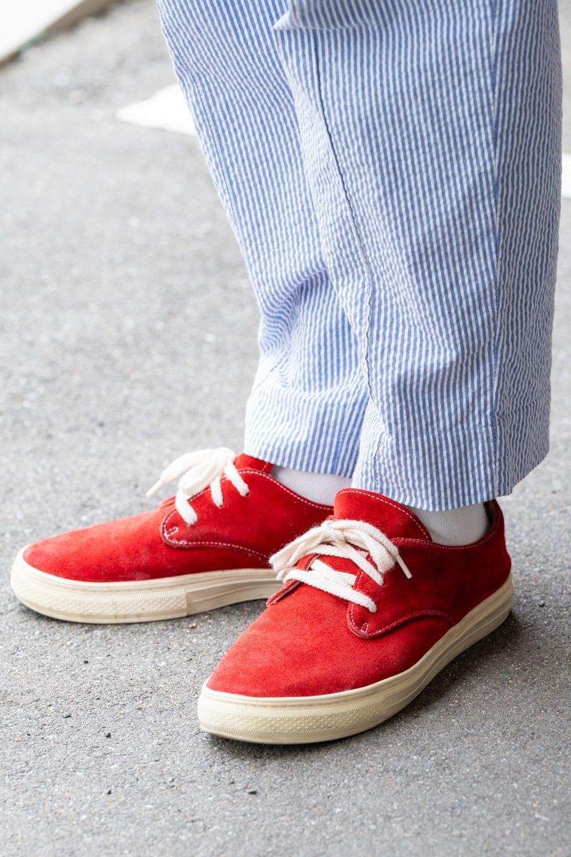 で、真っ赤なスニーカーをピンポイント使い。しかも、丸みのあるフォルムと毛足の長いベロアスエードで犬の“コーギー”に見立てた日本製の意欲作。超キュート。