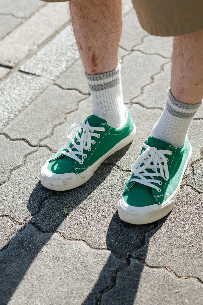 ▶︎伊藤さんのスナップをすべて見る伊藤光洋さん(45歳)お次は、鮮やかなグリーンのローテクスニーカーが際立つ装い。枯れ感のあるベージュやグレーといった曖昧色でまとめたコーディネイトに、フレッシュな新緑的イメージを加えた。
