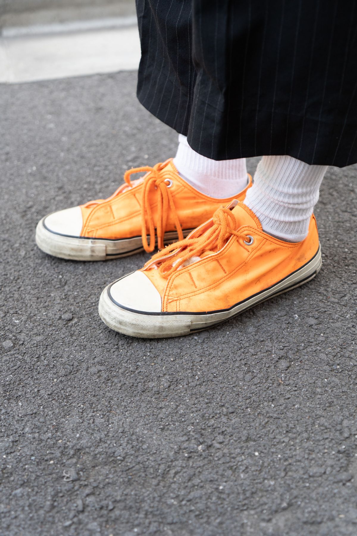 ただでさえ完成度の高いその装いが、スニーカーのオレンジカラーを味方につけてエネルギッシュな表情に。ピカピカではなく履き慣れた感じが、イヤミのない“こなれ見え”に導く。